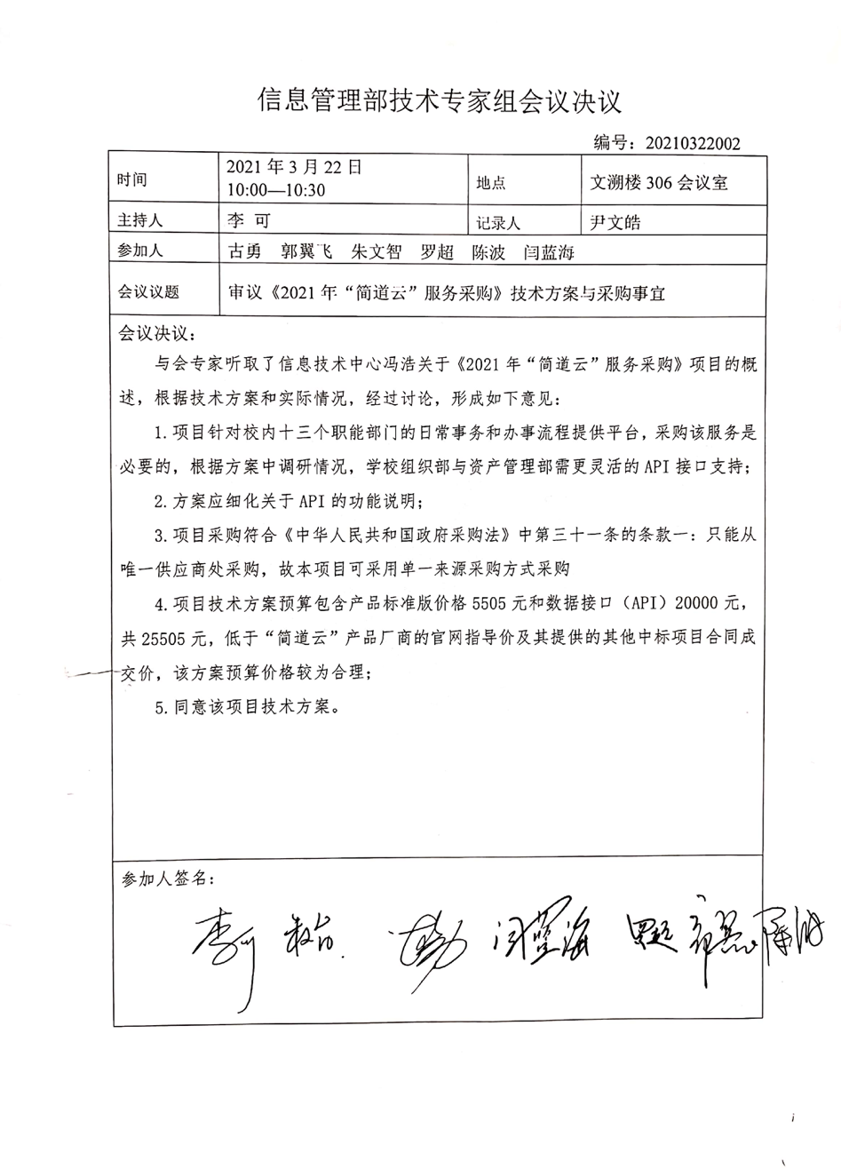 采用单一来源釆购方式的原因及说明: “码上办”的开发和运行依赖于PaaS架构的简道云平台。该云平台2021年度服务在2022年3月27日到期,如若未按时缴费将导致校内依赖“码上办”的165条线上流程完全无法工作,无法找到替代的工具。因此,该简道云2022年服务的采购是必要的。同时,应对各个业务部门新的需求,为了更方便的开展日常工作,需要同时采购简道云提供的API接口。