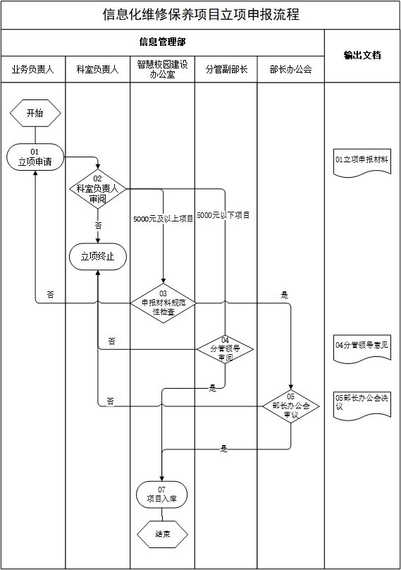 01 | 立项申请 | 业务负责人 | 业务负责人上报系统建设需求。 注意事项: 1. 明确建设主体、责任主体,如建设需求由外单位提出请附上工作联系函或“码上办”事项单; 2. 原则上仅适用于微、小型项目的列入年度维修保养建设清单中的项目。 | 附件1:《立项申报材料》 |