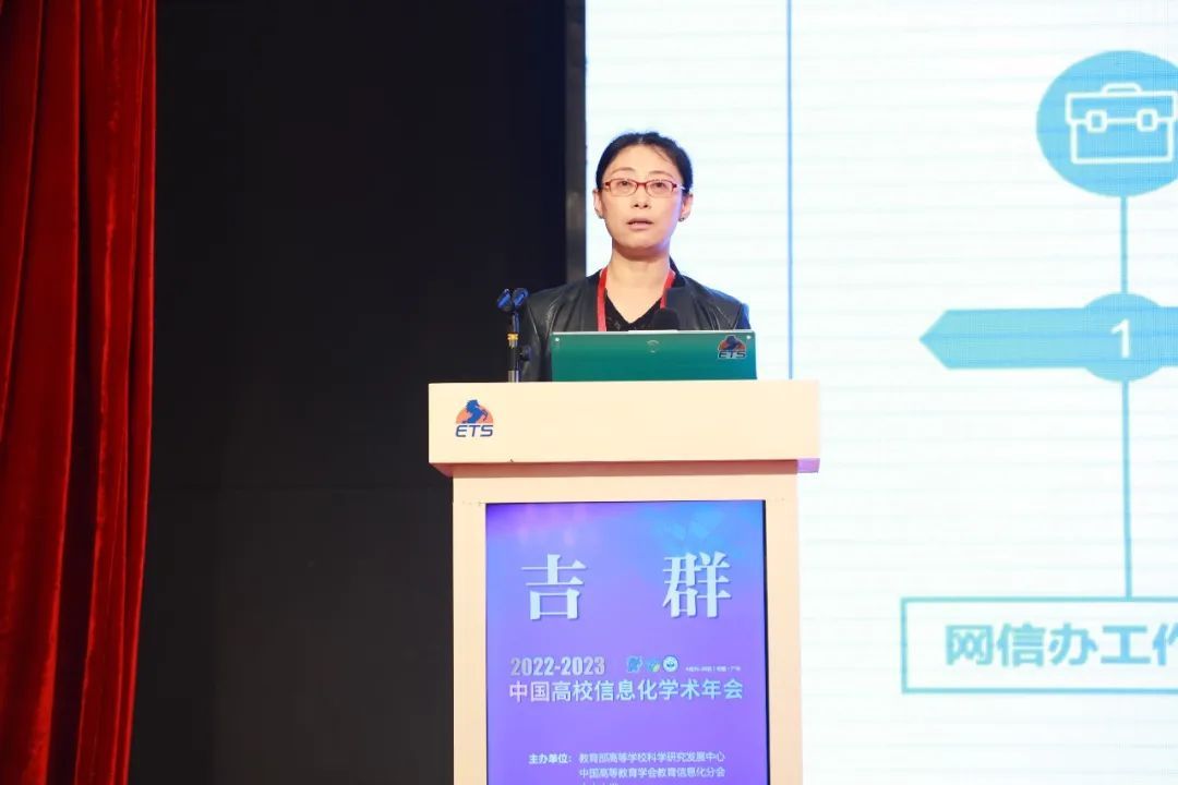 作为此次学术年会华中地区的代表发言单位,吉群部长以《新基建赋能教学数字化转型——米兰电竞·(中国区)探索与实践》为题,介绍学校从总体规划设计、体制机制创新等方面系统推进教育教学数字化转型的工作举措,并通过夯实支撑教学数字化转型的网络基础设施底座、打造适应校情的智慧教学生态、构建数据赋能的教学管评新形式三个维度,展示学校教学“全光网”改造、“物理+网络”融合学习空间等九个方面的创新应用成果,共同探索教育新基建与教育系统各要素的深度融合与创新发展。
