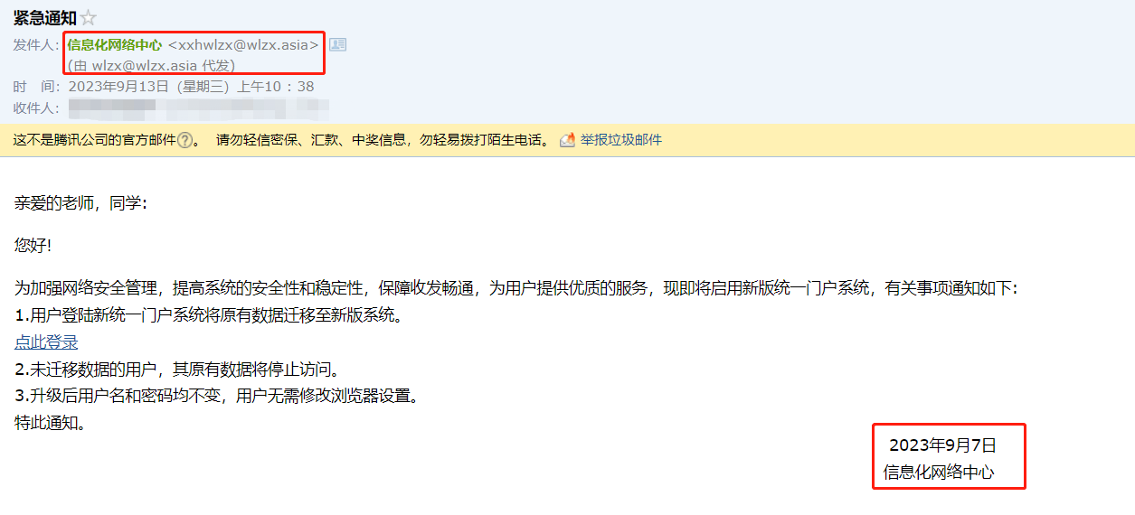 (通讯员 张亚行)近期,很多师生收到了一封号称来自“信息化网络中心”的邮件,标题中的“紧急通知”的字眼引人注意,这其实是一封常见的钓鱼邮件,此邮件有几个明显的“漏洞”:包括仿冒的发件人地址、虚假的部门名称等。