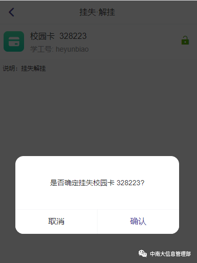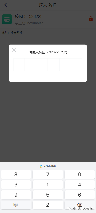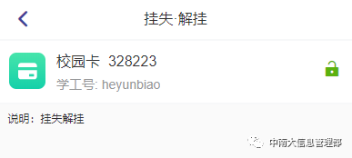 进入“挂失/解挂”功能,可对当前账户进行挂失,解挂过程中需要验证持卡人查询密码。