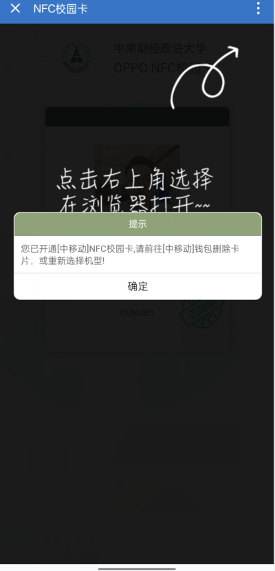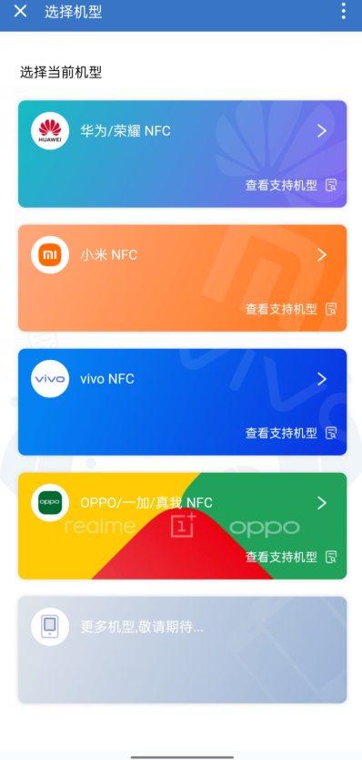 (1)企业微信进入“校园一卡通”,在“全部应用”找到“NFC校园卡”,进入选择手机机型页面选择您的手机型号,点击右上角