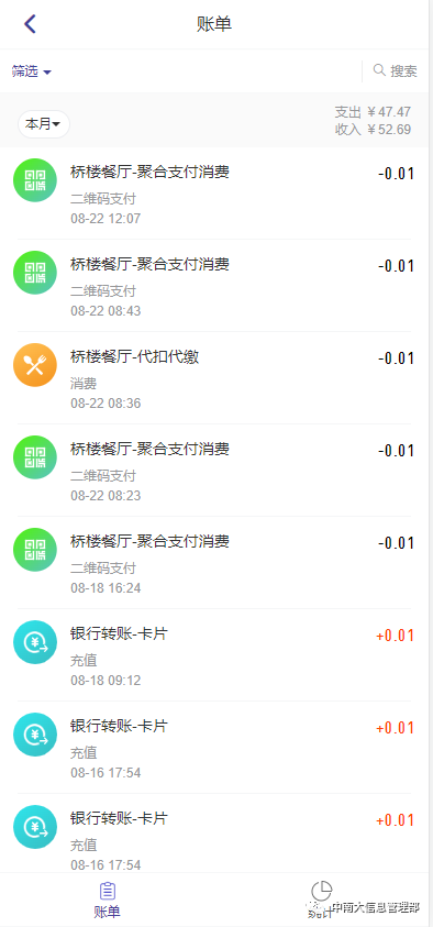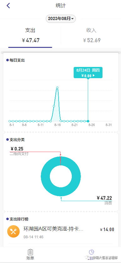 进入“账单”可按月份等多种组合条件查询持卡人交易信息,同时可对交易进行统计分析。