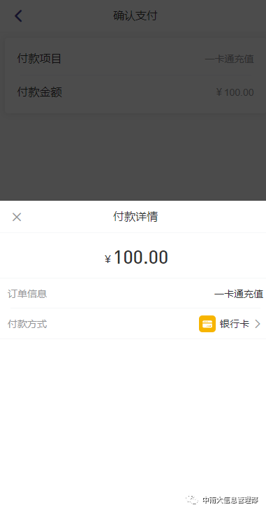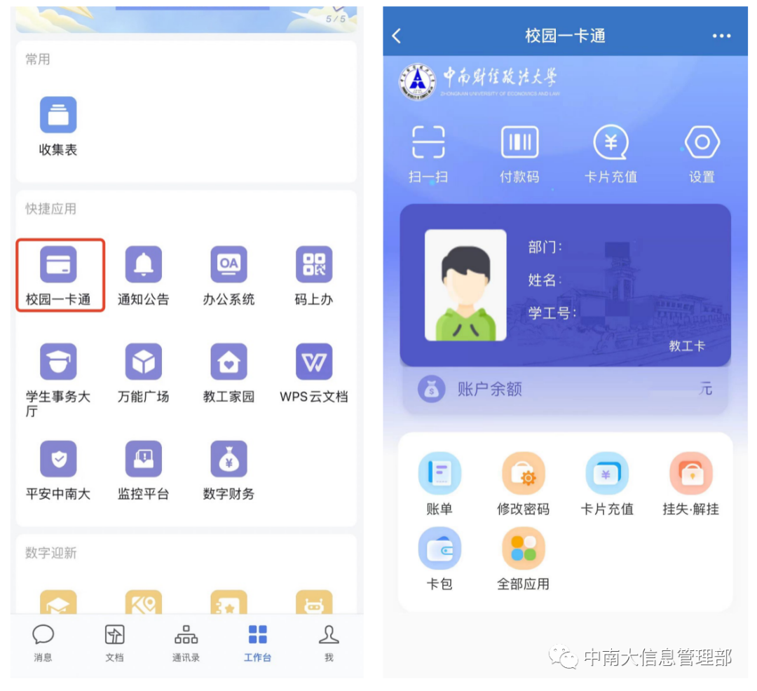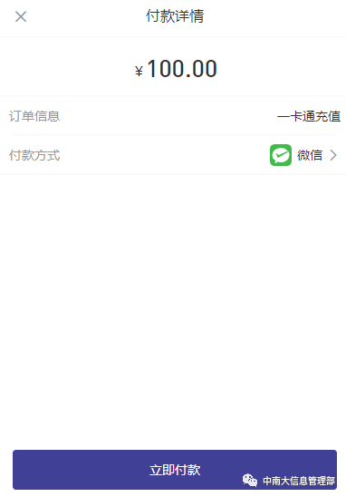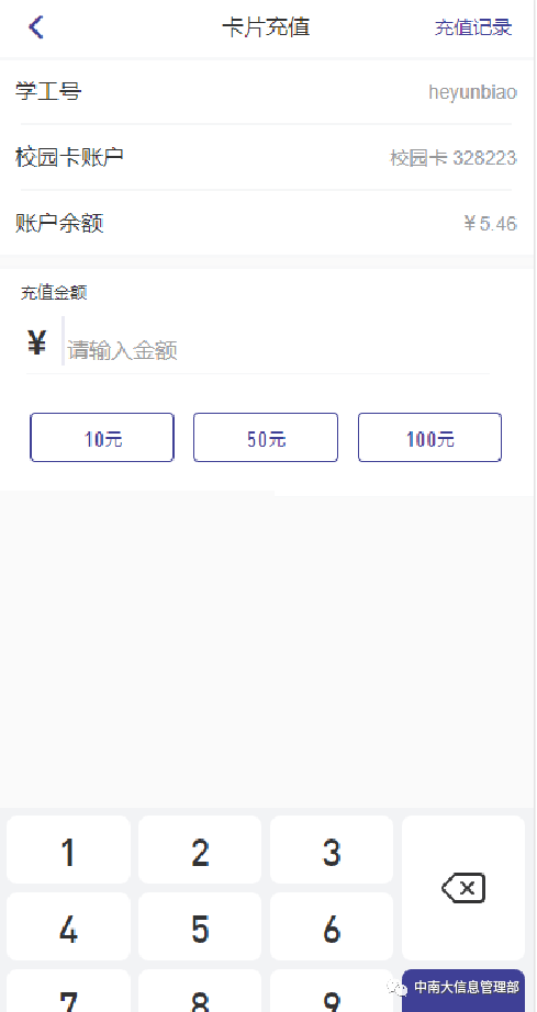 进入“卡片充值”功能,核对充值信息后,可选择“微信钱包”对校园卡进行充值。