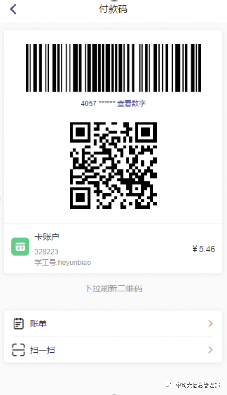 打开“付款码”可在终端设备上完成被扫支付消费,消费金额从卡账户余额中扣除。