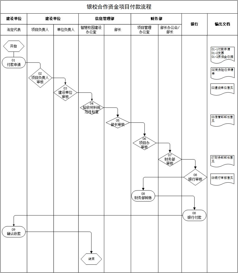 08 | 银行审核 | 合作银行 | 合作银行联系人审核付款材料。 注意事项: 付款材料统一交至智慧校园建设办公室由其转交至合作银行。 | 附件5:银行审核意见 |