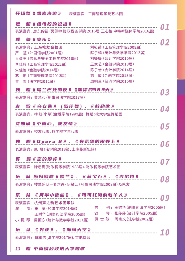 校友陈重志和吉他协会带来了歌曲《男孩》,和工商管理学院1999届许海、法学院2005届庄华阳、财政税务学院2009届李华、经济学院2011届张锦洲合作了《海阔天空》,唱出了每个人心中不羁的灵魂、对自由的向往、对自我的坚持。
