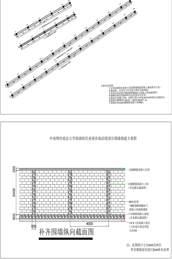 1、采用C30商砼混凝土浇筑围墙钢筋混凝土基础梁及柱子;