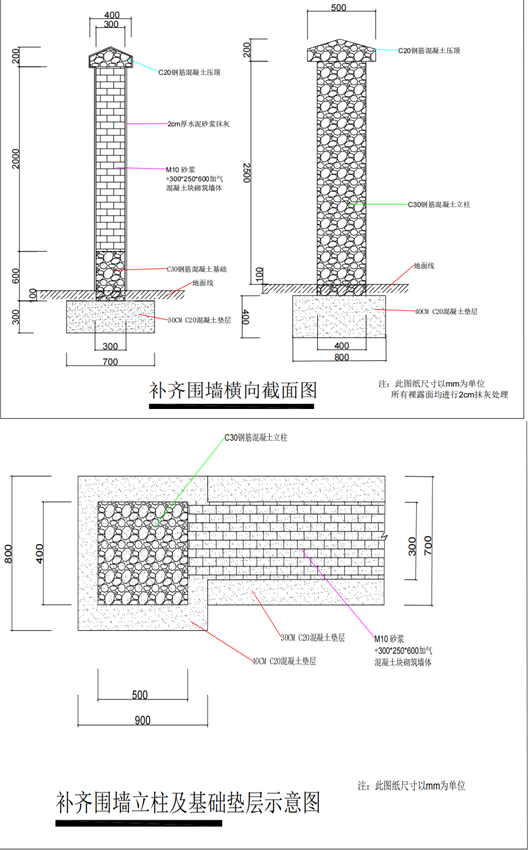 4、围墙表面采用2cm厚1:2.5水泥砂浆进行抹灰;