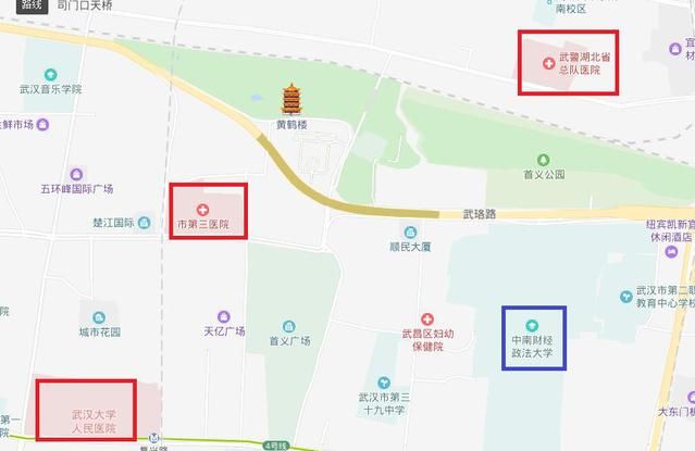20点后请各位师生到学校对口医院进行急诊,首义校区附近对口医院地图如下: