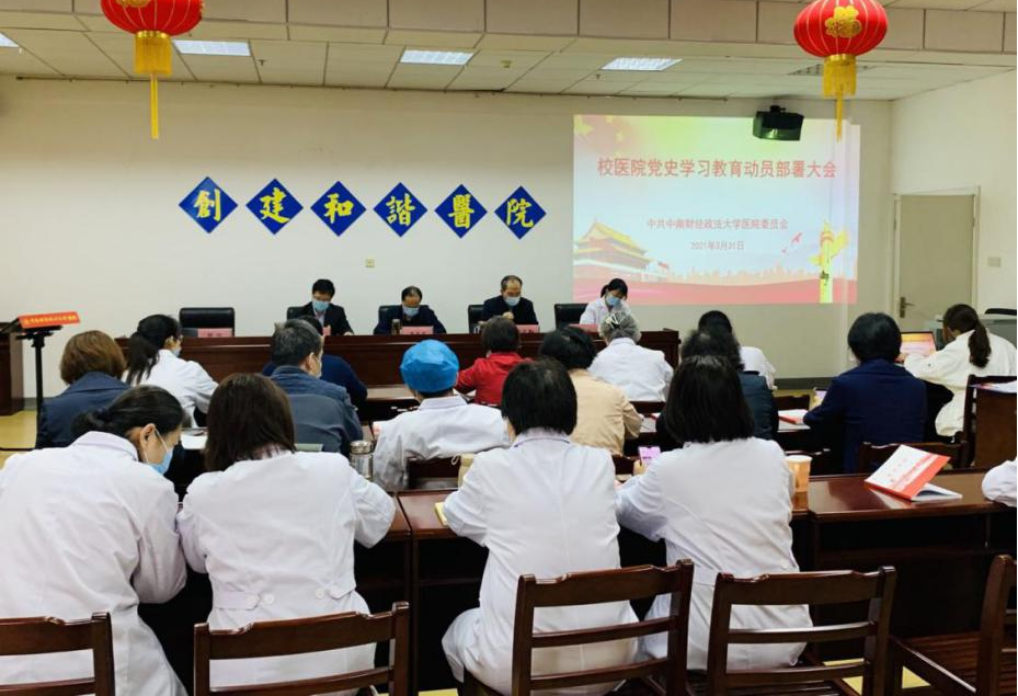 黄之勤传达学校党史学习教育动员部署大会、学校2021年全面从严治党工作会议精神。校医院党委委员、医疗部主任刘晓玲宣读《关于成立校医院党史学习教育领导小组的通知》。党委委员、党政办主任胡弦宣读《校医院开展党史学习教育工作方案》。