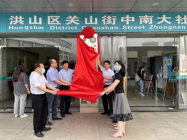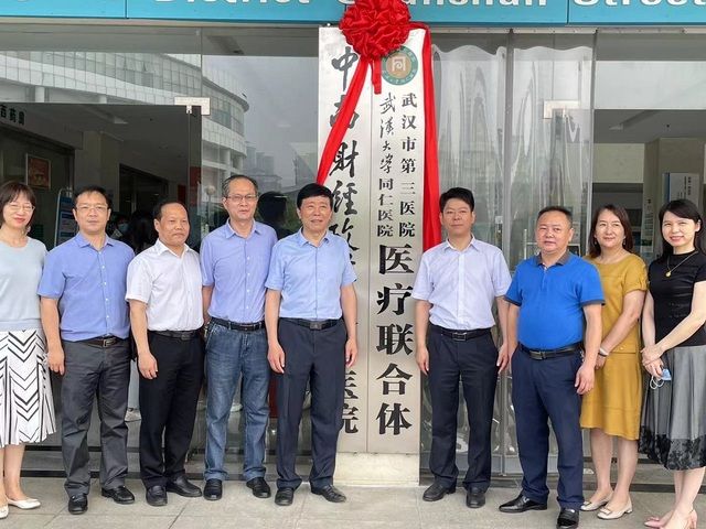 在校医院一楼大门前,申祖武、刘争文、黄之勤、李先卓、罗才奎等为校医院与武汉市第三医院共建医联体揭牌,校医院副院长汪勇、副院长刘晓玲、医务科科长管成英、党政办主任胡弦和副主任黄涛以及武汉市第三医院社会服务部副主任张素华、副主任陈汉英、联络员赵晓牧等,共同见证了这一重要时刻。