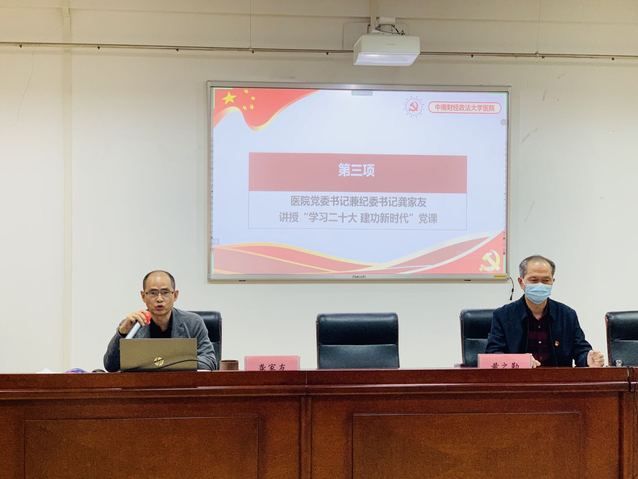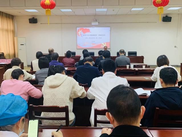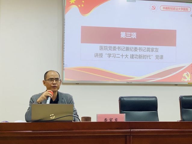 医院党委书记兼纪委书记龚家友主讲题为“学习二十大 建功新时代”党课,他传达了教育部直属系统传达学习二十大精神大会等相关会议精神,全面系统解读了党的二十大报告。他提出要通读、精读党的二十大报告,关注报告中的新表达、新概括、新论断,并结合学习贯彻落实二十大精神,深度剖析医院工作面临的机遇与挑战。他要求全院党员干部要以更高的政治站位和政治自觉,全面深入学习贯彻落实党的二十大精神。在医院党委的领导下,将二十大精神努力贯穿于工作中,在本职岗位上全心全意服务师生,脚踏实地干好工作,努力为师生提供更加贴心、高效、优质的医疗服务。