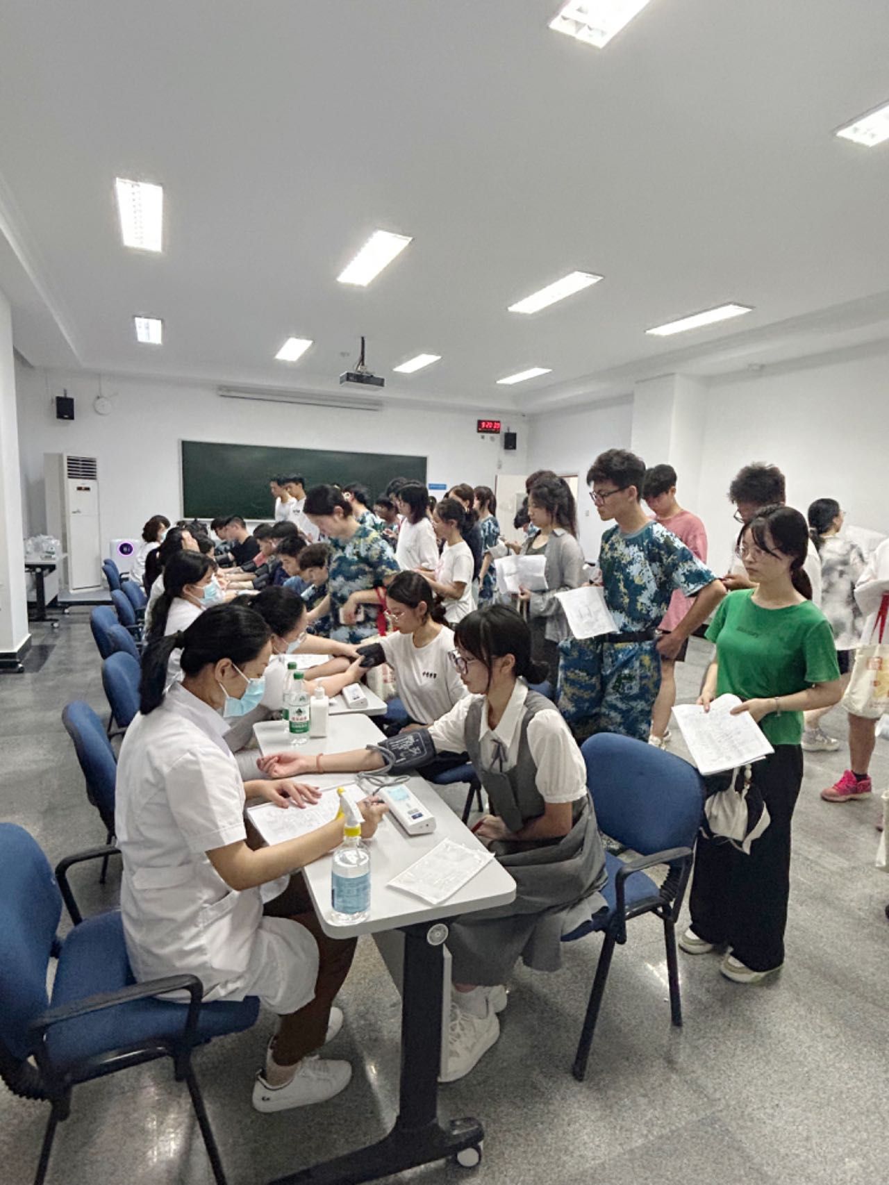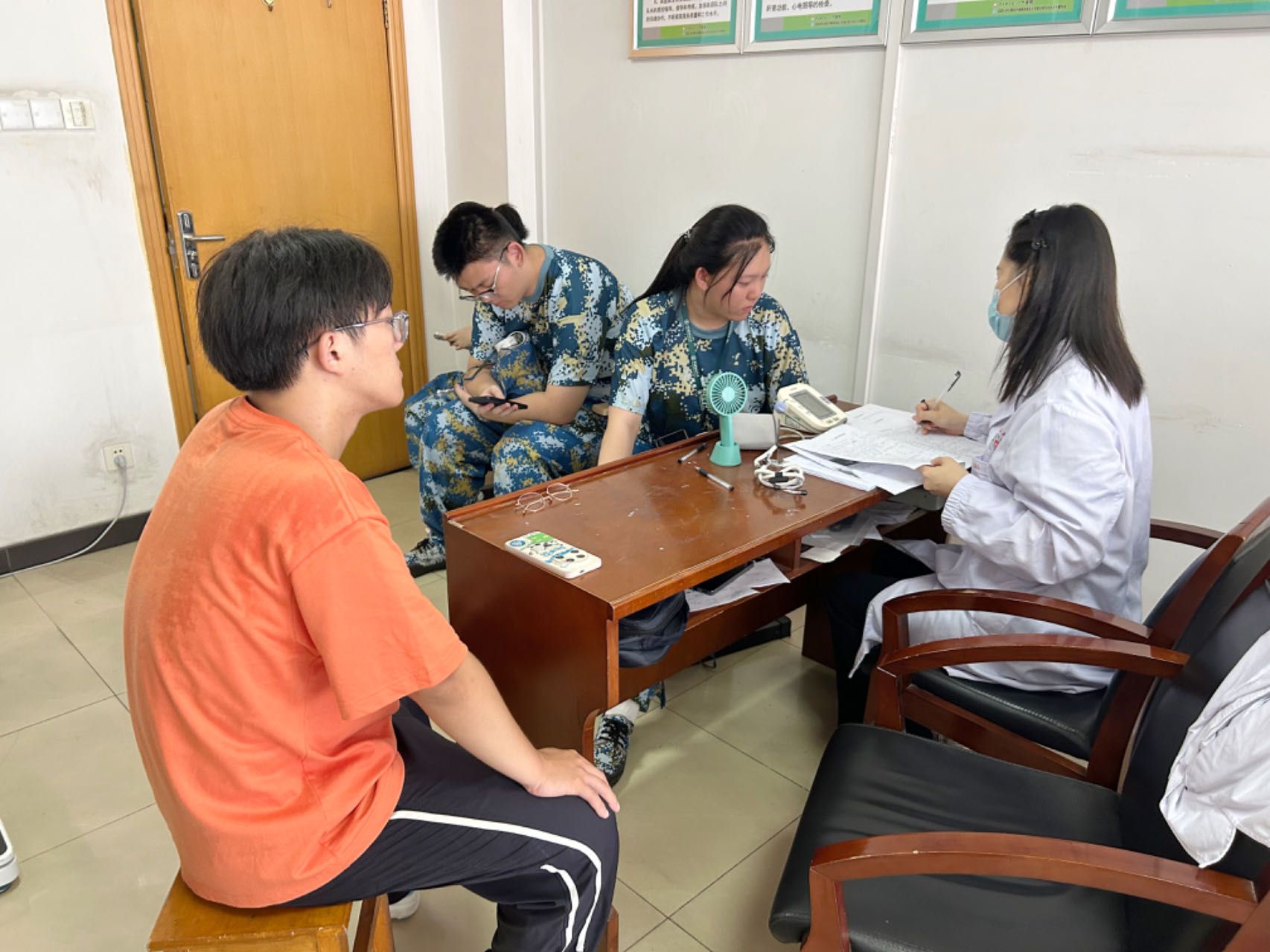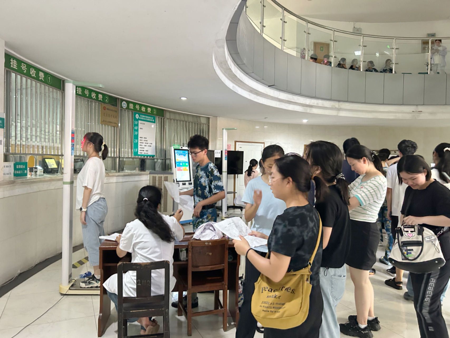 天气炎热,院领导每天到体检现场指挥协调,医务人员全身心投入体检工作,汗水浸透了工作服,一遍又一遍,他们从不叫苦叫累,微笑面对每一个前来体检的同学。为了确保安全有序,医院、保卫部在每个体检项目都安排了工作人员引导分流。