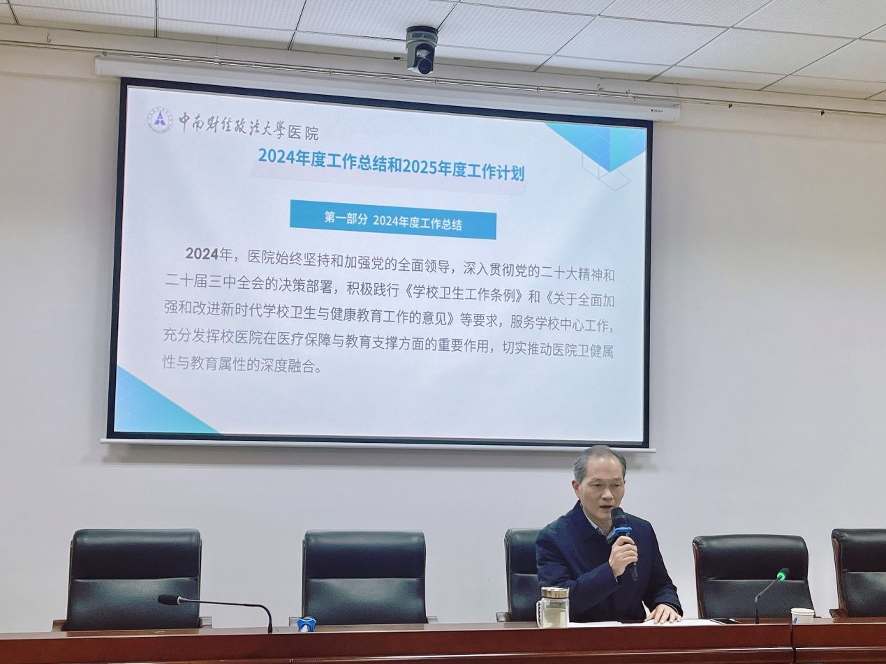院长黄之勤作了医院2024年度工作报告。医院在校党委和行政正确领导下,以高质量党建引领医院高质量发展,实现党建与医疗工作深度融合,医疗质量稳步提升,特色门诊有序推进,“健康育人”系列活动扎实开展,对口支援和定点帮扶不断加强,圆满完成了年度工作任务。报告提出2025年工作思路,即“一二三六发展规划”,坚持一个目标:提升医疗服务水平和能力,满足师生健康需求;推进两项改革:深化公费医疗机制改革和公共卫生绩效改革;强化三个提升:实现科学管理、医疗质量和服务水平的全面提升;落实六项重点任务:深化文化内涵建设、加强人才培养力度、提升特色专科水平、强化应急保障体系、健全医院管理制度、实行绩效激发动能。