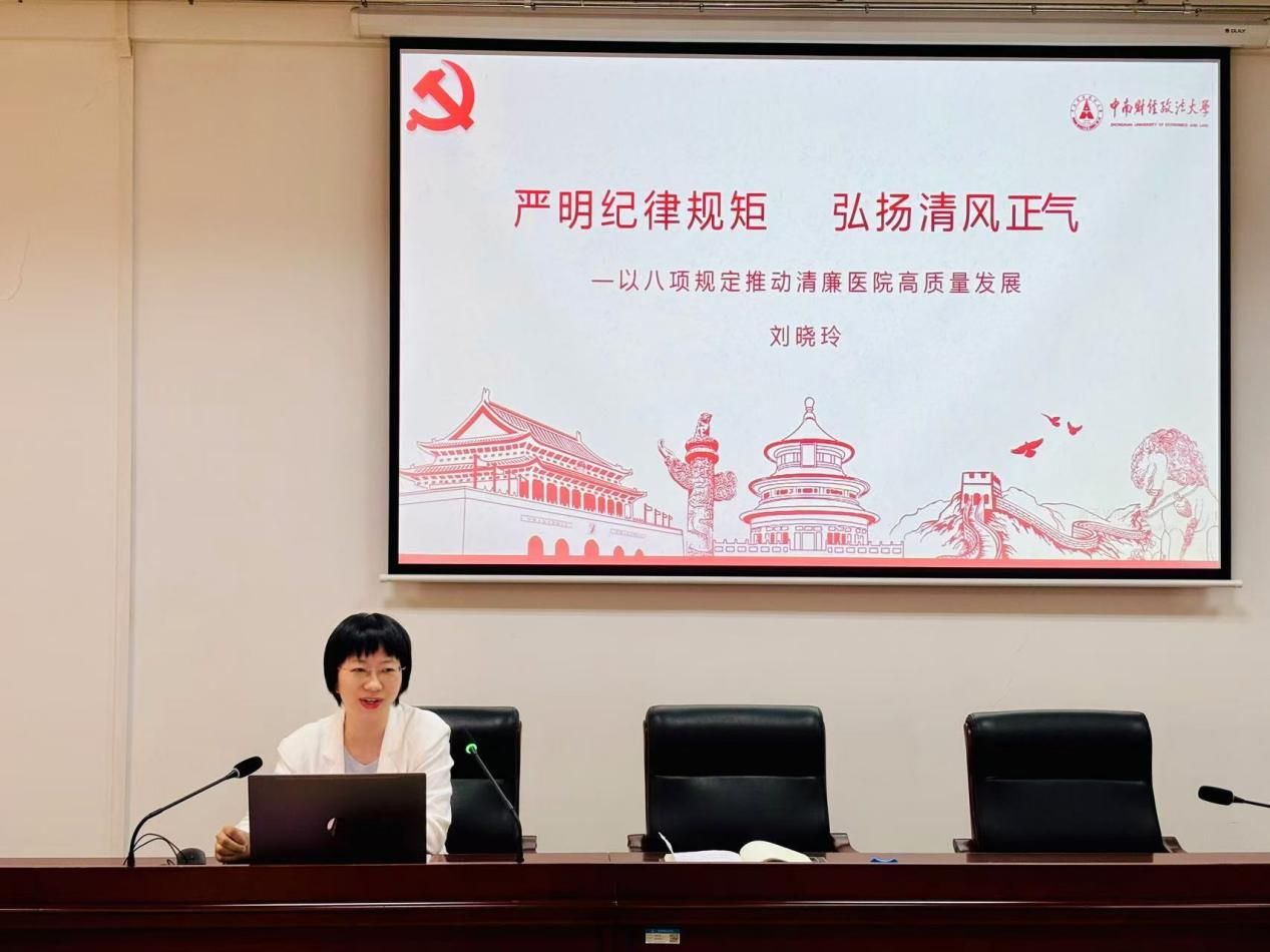 党委委员、副院长刘晓玲带来《严明纪律规矩,弘扬清风正气——以八项规定推动清廉医院高质量发展》的党课,强调纪律建设对医院发展的重要性,为打造清廉医院提供思想指引。刘晓玲结合医疗系统的有关案例,用“活教材”敲响“警示钟”,让党员干部切实感受到纪法就在身边,教训近在眼前。