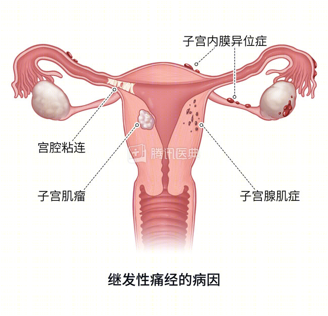 (二)继发性痛经:大多数由器质性疾病引起,常见于子宫内膜异位症、子宫腺肌病、盆腔炎性疾病等,常在月经初潮后数年才会出现。