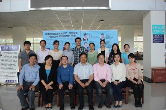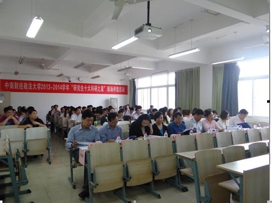 (通讯员 武韬 张紫君)为弘扬学术文化精神,端正风清气正之学风,激发学术创新热情,提升研究生学术素养,研究生院、党委研究生工作部于2014年5月15日下午在文添楼105教室举办“研究生十大科研新星”评选活动。本次活动邀请了哲学院政治学系主任万健琳教授、经济学院罗良文副院长、财税学院侯石安副院长、金融学院唐文进副院长、法学院民商法系副主任孟令志教授、刑事司法学院苏彩霞副院长、工商管理学院国际贸易博士生导师钱学锋教授、会计学院张敦力副院长担任评委,研究生院张德淼副院长出席本次活动并致辞。