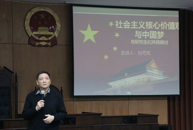 (通讯员 白玉 刘倩 周志源)12月23日晚7时,由研究生院、党委研究生工作部主办,校研究生会承办的第87期“文澜大讲堂”在文泰楼模拟法庭(二)举行。本次讲座邀请我校博士生导师、国务院政府特殊津贴获得者刘可风教授作为主讲人,讲座主题为“践行社会主义核心价值观,助推中国梦”。研究生院常务副院长胡立君教授,党委研究生工作部笪宁副部长,研究生思政教育办公室主任白玉老师以及来自各学院(中心)的百余名硕士、博士研究生参加了本次讲座。