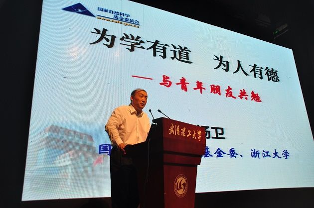 随后,杨卫院士作了题为《为学有道 为人有德——与青年朋友共勉》的主题报告。杨卫院士向同学们分享了他自己科研之路上的求索经历,生动阐述了为人治学所应具备的“道”与“德”的深刻含义。他结合目前学术界出现的心态浮躁、急功近利、抄袭剽窃等学术不端的现实事例,告诫同学们要做到“四不”,即不侵犯他人知识产权、不接受陌生人的帮助、不在学术上投机取巧、不在学术上游戏人生。正如马克思所言,“在科学上没有平坦的大道,只有不畏艰险沿着陡峭山路攀登的人,才有希望达到光辉的顶点”。