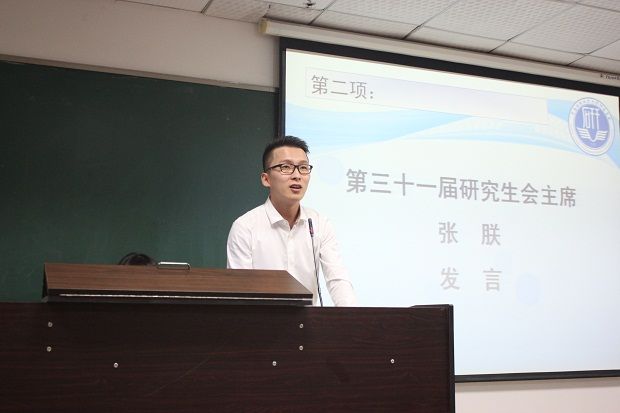 第三十一届研究生会主席张朕代表主席团发言。他十分感谢白老师长期以来对研究生会及《中南研语》编辑部工作的大力支持和帮助,并分享了自己在校研会工作的切身感受和想法。他希望同学们能摒弃功利思想,用热忱的心和高度的责任感对待每一项工作;以研会为整体,加强部门之间的交流与沟通;不畏艰险,在面对困难和压力时做到坚守和坚持。