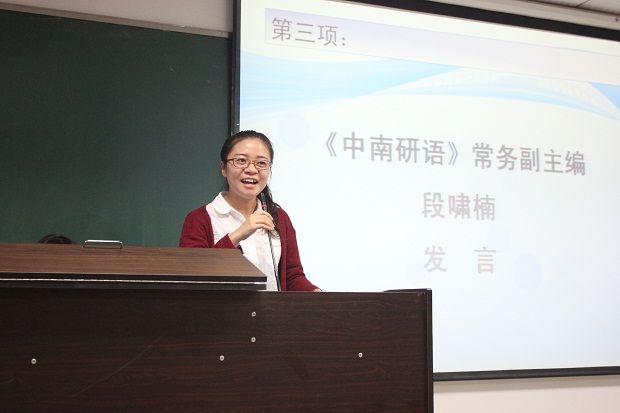 《中南研语》常务副主编段啸楠回忆了《中南研语》杂志从初创阶段到小有成就的发展历程,她结合自身的经验和工作感受,希望同学们以积极、热情的态度来对待编辑工作,使自己的研究生生涯不留遗憾。