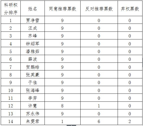 领导小组对14名申请人的申报材料进行了审核和评定,根据科研积分由高到低排序如下表。针对博士机动名额的申请人,领导小组以实名投票方式表决,表决结果为: