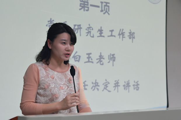 大会伊始,白老师代表研究生院、党委研究生工作部宣读了校第三十二届研究生会、《中南研语》第四届编委会成员的聘任决定并发言。白老师对新成员的到来表示祝贺和欢迎,并希望同学们能在学习实践中加强思想引领,在服务大众中实现个人价值,在开拓创新中完善组织建设,在交流协作中共同成长进步。她希望研究生会和《中南研语》编辑部的新成员能够尽快融入集体,戒骄戒躁,恪尽职守,厚积薄发,打造精品活动,提升刊物质量。