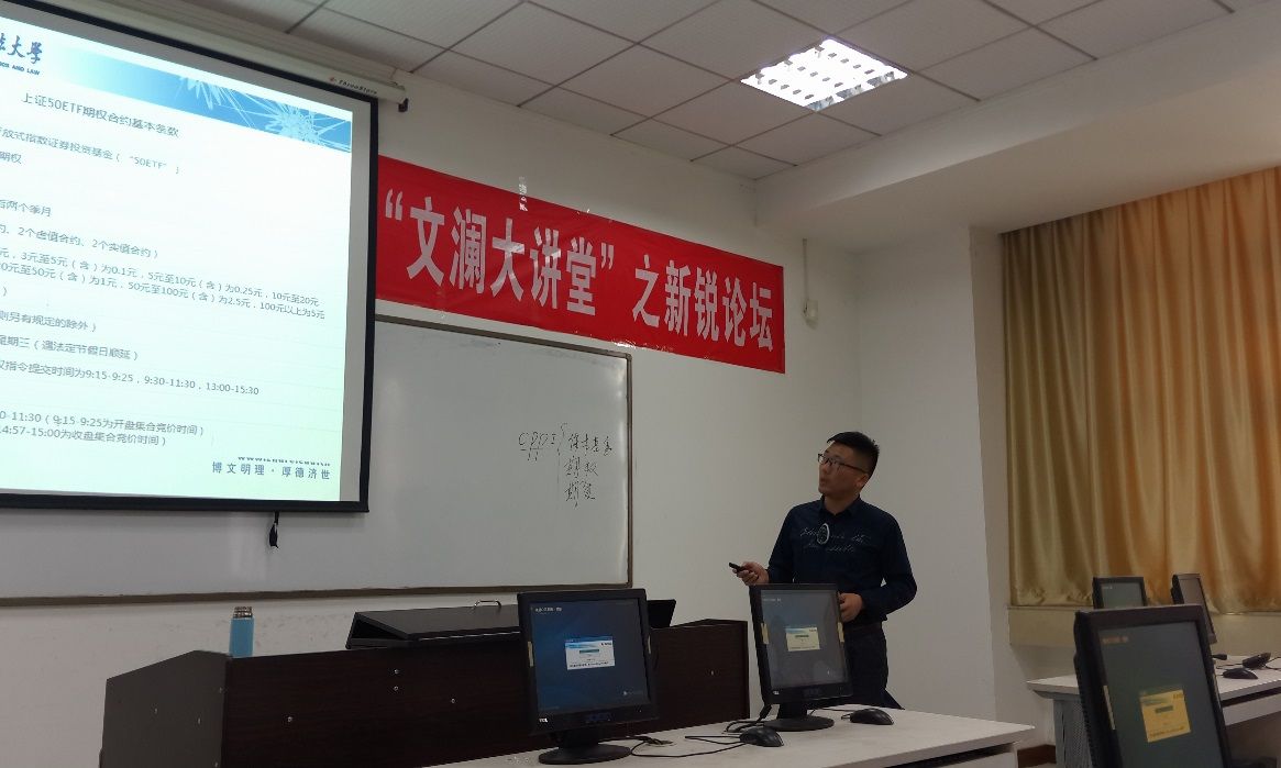 李庆老师讲座的题目是“期权价格的非参数和半参数方法”。老师通过调查,摸清同学们对期权知识的了解,发现大多数同学基础薄弱后,便开始耐心讲解。首先,李老师介绍了期权的定义、分类和基本应用,并简述期权管理与交易机构,以及国内市场的一般运作,让大家对期权有了初步认识;然后,李老师细化了期权的理论应用,比如风险管理、金融产品风险设计、股权激励等,并推荐了几个认可度较高的金融知识比赛,鼓励同学们参加比赛,深入了解期权知识。在同学们对于期权有了充分了解后,李老师开始进行理论分析,讲授期权定价模型。老师从最经典的BS定价公式讲起,以欧式看跌期权的计算为例,推导计算公式,并展示如何用matlab软件进行多个期权价格的计算,然后深入到非参数期权定价理论,介绍了这一领域的大牛,普林斯顿大学的Ait-Sahalia教授,并通过该教授的定价模型,说明非参期权定价的难度以及解决方法,虽然理论推导比较枯燥,但在李老师的悉心讲解和严密的数学推导下,大家都聚精会神地听讲。