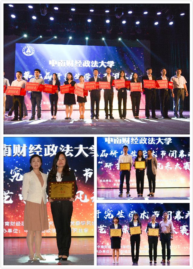 随后,党委研究生工作部周佳玲部长宣读了《关于表彰第七届研究生学术节先进集体和先进个人的决定》及《关于表彰2016年研究生国家奖学金获奖学生的决定》。财政税务学院等15个学院(中心)被授予“研究生学术节先进集体”称号,其中:财政税务学院荣获一等奖,法学院、统计与数学学院获得二等奖,会计学院、金融学院、公共管理学院荣获三等奖;工商管理学院等9个学院获得优秀组织奖;龚聪莉等61名研究生被授予“研究生学术节先进个人”荣誉称号;周丹等36名博士研究生、李朝阳等165名硕士研究生荣获2016年研究生国家奖学金。相关职能部门负责人分别为获奖学院和个人颁奖。