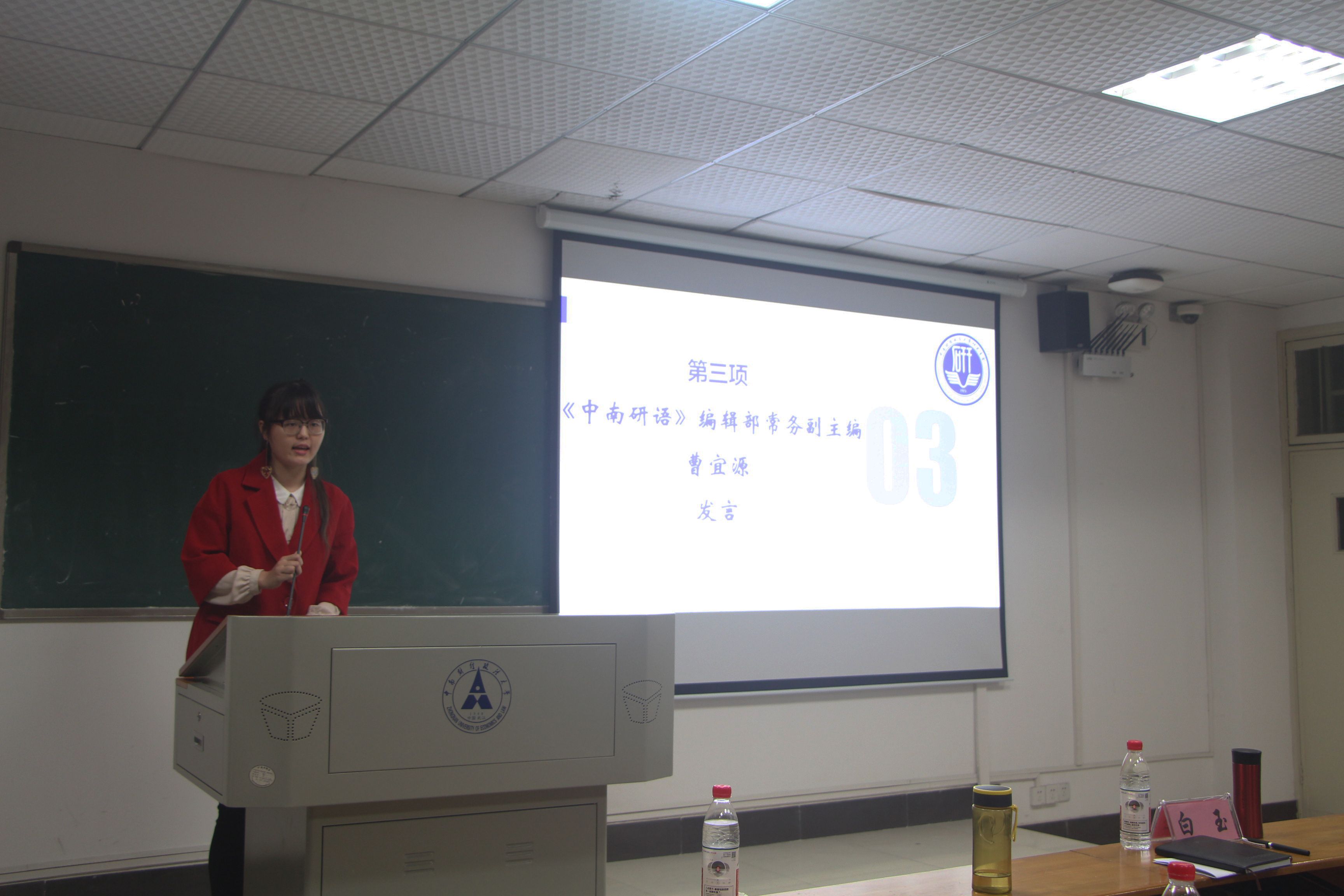 第五届《中南研语》编委会常务副主编曹宜源同学在发言中指出,在座的各位新成员都是积极进取、奋发向上的同学,希望大家在忙于自己学业的同时,能够认真踏实地承担自己所在部门的职责,努力为校级研究生组织和学校的发展贡献一份力量。