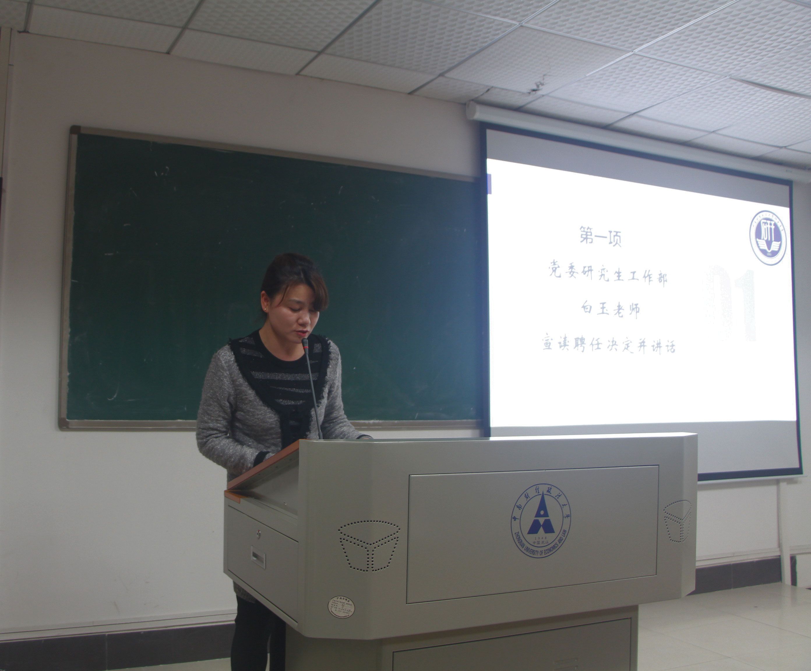 大会伊始,白玉老师代表研究生院、党委研究生工作部宣读了校第三十三届研究生会、第五届《中南研语》编委会成员的聘任决定并作出发言。她首先对加入校研究生会和《中南研语》编辑部的全体新成员表示了热烈的欢迎。随后,她向所有成员提出了把牢政治性,共筑思想基础;保持群众性,服务成长成才;增强先进性,完善自身建设等三个工作要求,同时希望大家精诚团结、密切配合,强化内外交流,充分发挥学校与研究生之间的桥梁纽带作用,为学校的建设和发展做出应有的贡献。