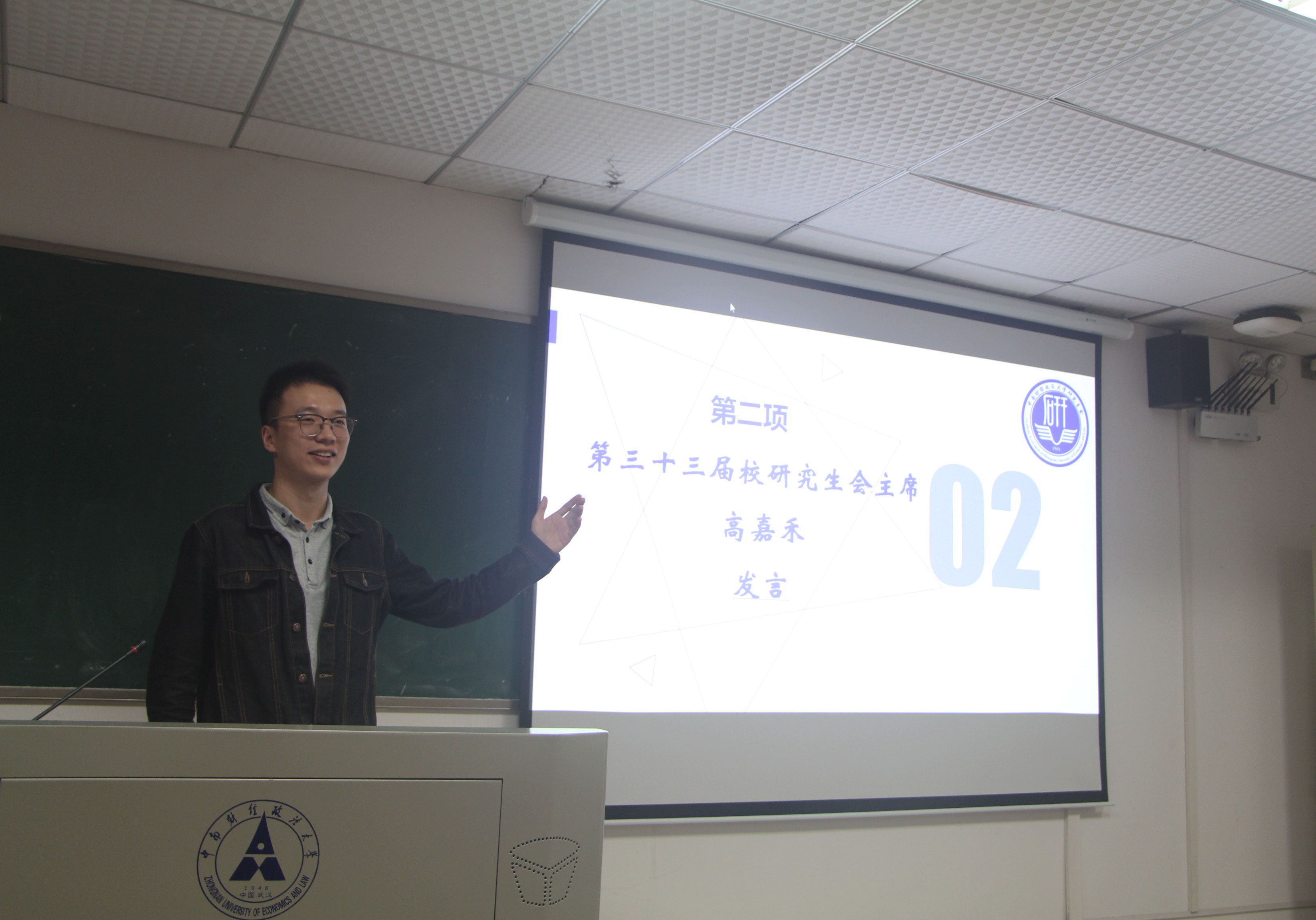 第三十三届校研究生会主席高嘉禾同学代表主席团作了发言。他表示,新一届成员是校研会的新鲜血液和新生力量,希望大家能够铭记校研会悠久的历史,承继往届校研会人的辛苦成果;希望大家勇于担当,恪尽职守,做好本职工作;希望大家面向未来,发扬创新精神,共同致力于校研会的发展。