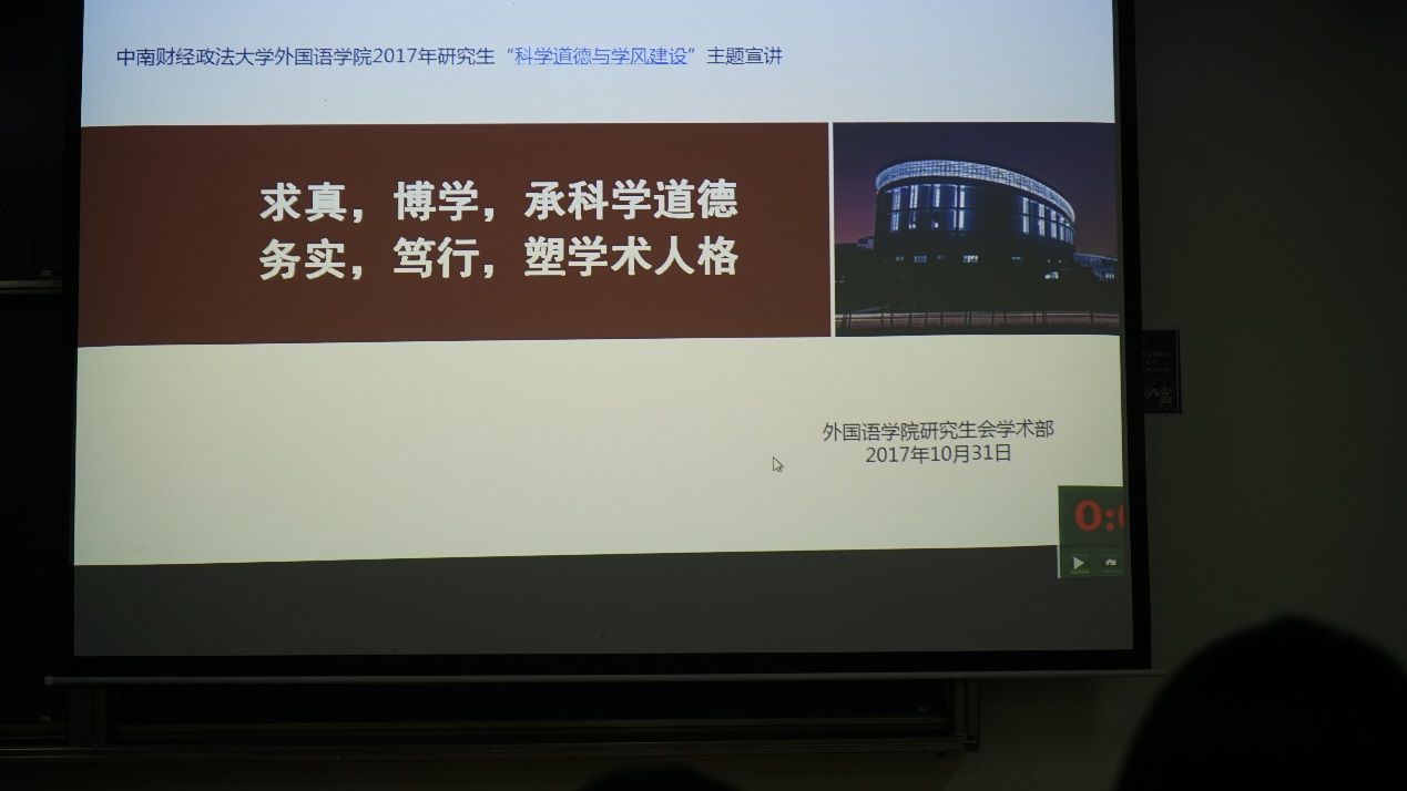 (通讯员 周国锋)2017年10月31日19:30,我校外国语学院研究生科学道德和学风建设宣讲教育报告会在文添楼202教室举行。会议由2017级研究生蔡娇同学主持,外语学院17级全体研究生参加了此次活动。