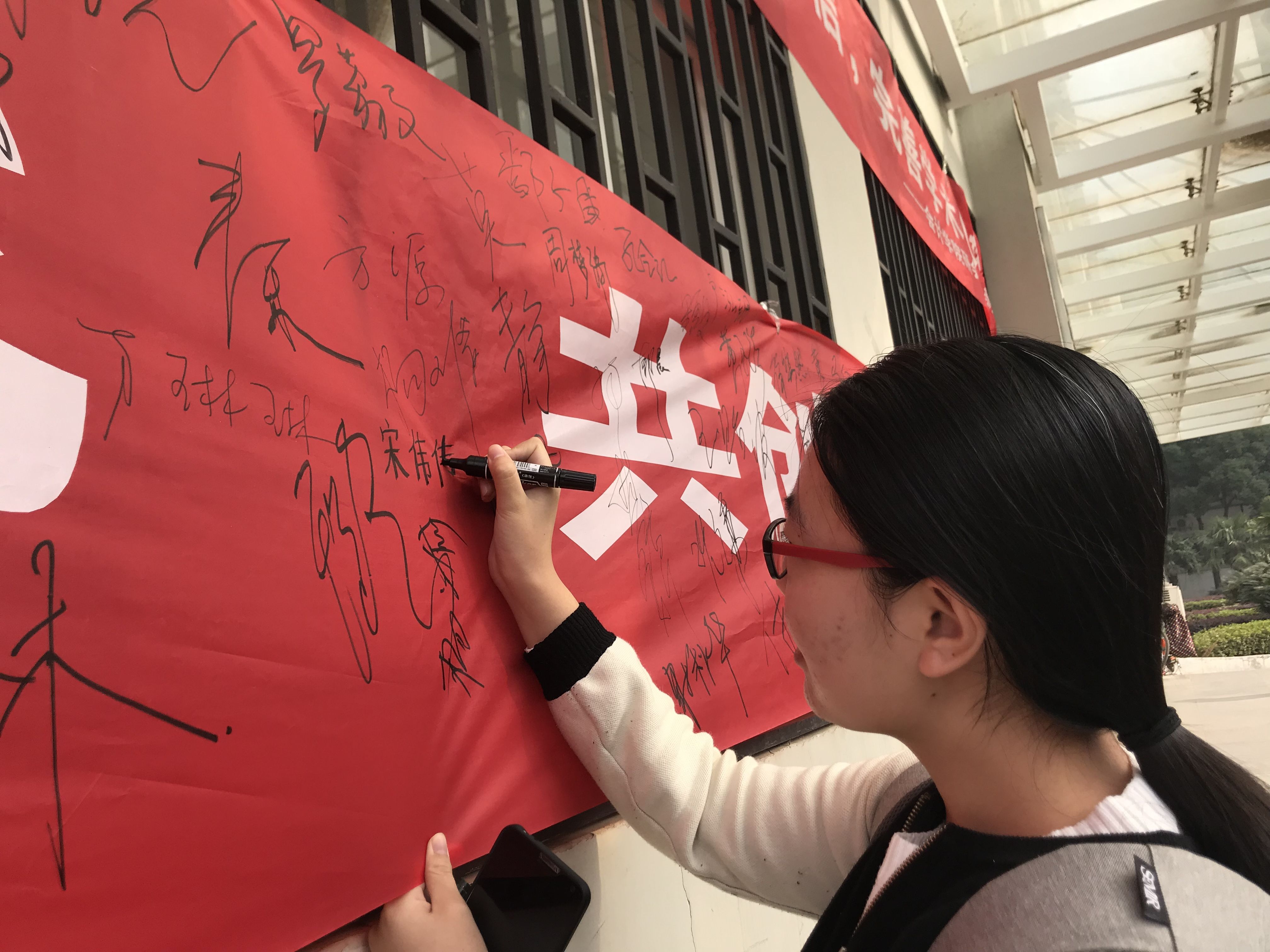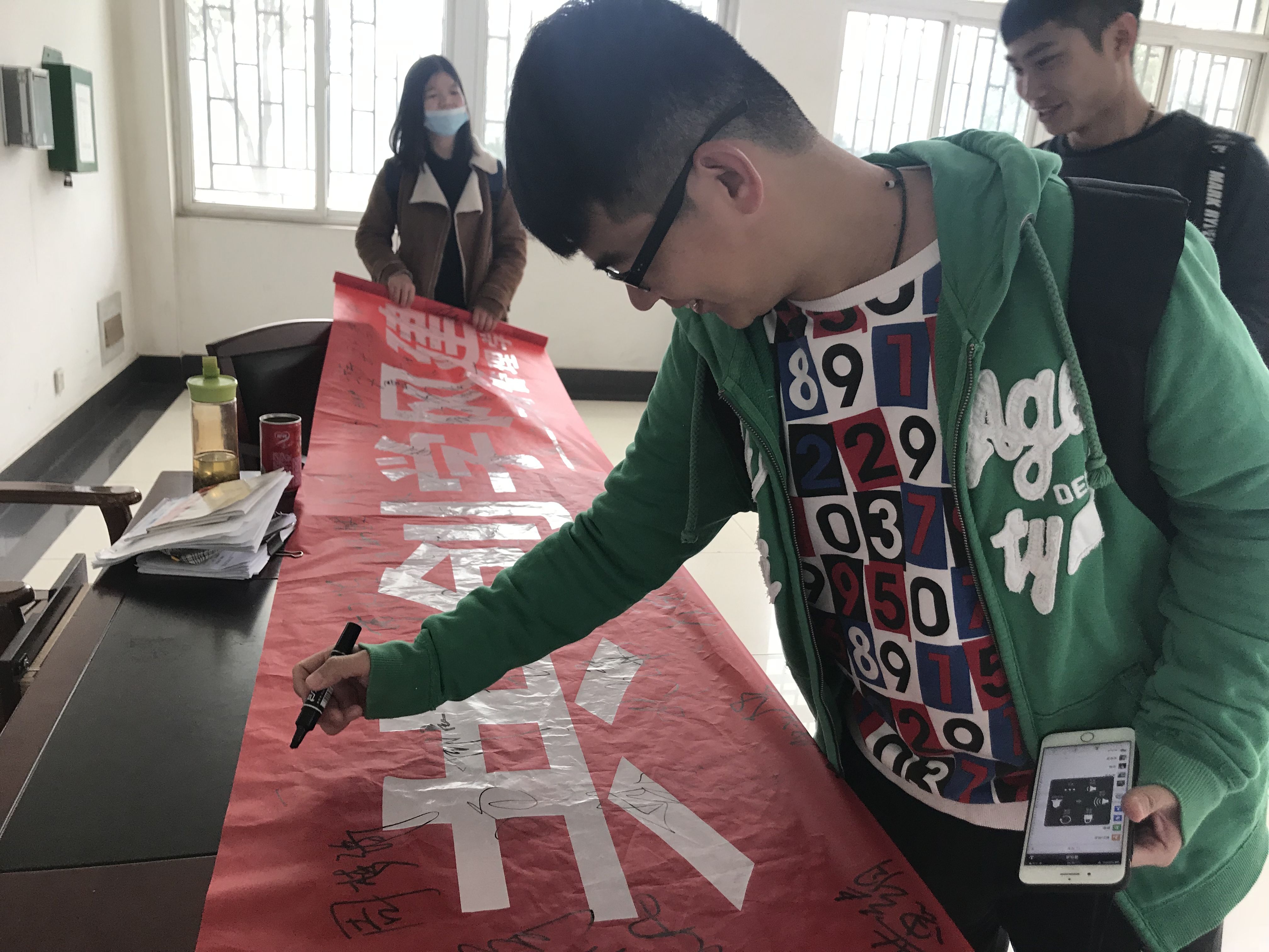 2017年11月14日中午,学术科研中心的成员们在文添楼挂出口号横幅并举行签名活动,同学们的参与热情极高。