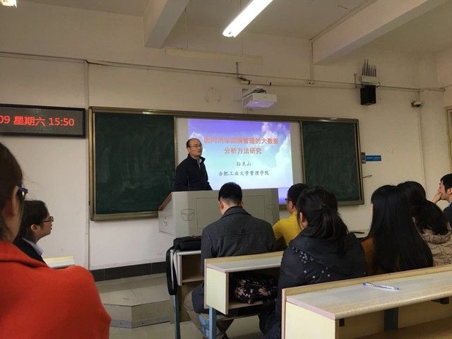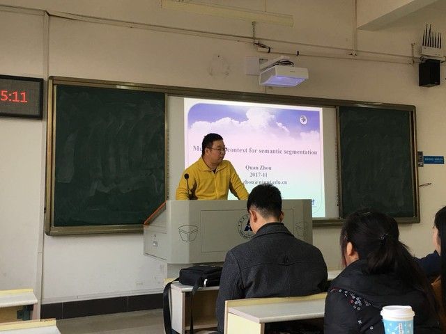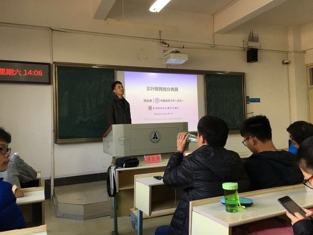 下午两点,讲座在文添楼101和107教室继续进行。在101教室,中国地质大学(武汉)计算机学院教授、智能地学信息处理湖北省重点实验室副主任蒋良孝老师,对贝叶斯网络分类器,尤其是朴素贝叶斯分类器的改进算法进行了详细报告。南京邮电大学通信与信息工程学院副教授、硕士研究生导师周全教授,与大家分享了回顾远程和短程语境表达的方法,然后介绍了其有关多尺度语境表述的图像语义分割方面的工作。合肥工业大学管理学院副教授、硕士生导师孙见山教授,与大家分享了汽车品牌竞争网络构建和用户个性化服务的相关内容。
