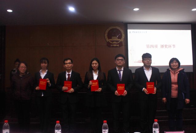一番激烈角逐之后,法律硕士教育中心的李琦和刑事司法学院的马博培荣获一等奖。信息与安全工程学院的柴健、新闻与文化传播学院的黄钟灵、公共管理学院的杨嘉琦、法学院的刘旺、会计学院的刘铮荣获二等奖。刑事司法学院的黄周良、哲学院的王菲娜、经济学院的范小山、公共管理学院的黄永贤、财政税务学院的陈阳荣获三等奖。哲学院、财政税务学院、法律硕士教育中心获优秀组织奖。比赛结束后,嘉宾们为获奖选手颁奖并合影留念。