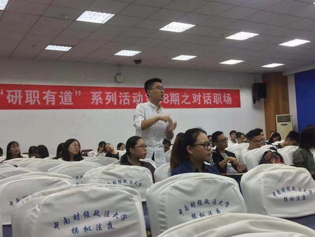(通讯员:曹丽萍、程坦)2018年11月4日星期日晚7:00-9:00,第38期“研职有道”之对话职场在文泰楼模拟法庭(二)举行。此活动是由研究生院、党委研究生工作部、米兰电竞·(中国区)研究生会主办,法学院研究生会承办。此次活动旨在为法学院研究生提供一个了解就业形势、提高就业能力、获取就业岗位的机会,为已毕业的优秀师兄师姐与在读的研究生们建立一个关于求职、工作经验交流的平台。