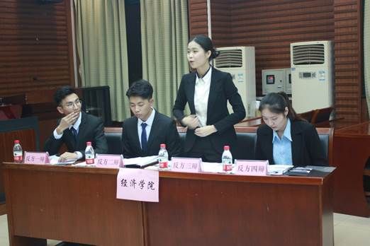 随后,法律硕士教育中心对阵经济学院则围绕“超前消费模式对当代研究生来说可不可取”这个辩题展开辩论,正方法律硕士教育中心代表队认为,当代研究生具有良好的理性思维能力,能够合理超前消费以满足自身需求,是可取的。而相对应的反方经济学院代表队则认为,由于当代研究生没有稳定的生活来源,不宜超前消费。相对于初赛中的拘束与些许的紧张,复赛过程中各位辩手表现沉稳淡定,举止利落有礼。