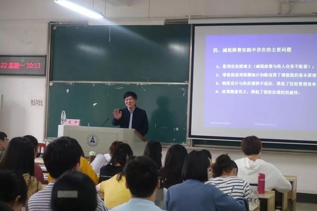 (通讯员 温婷)2019年4月22日上午9点,第159期“文澜大讲堂”之名家讲坛在文添楼102教室举行,财政税务学院博士生导师、全国著名税收理论与实务专家艾华教授为我院师生做了主题为“减税降费的效应探究”的学术讲座。此次讲座由财税学院副院长魏福成副教授主持,讲座吸引了众多师生到场聆听。