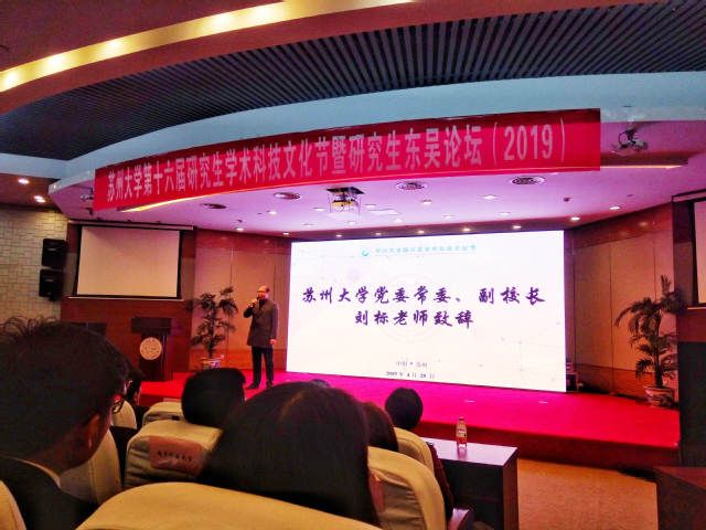 (通讯员卢帆)2019年4月28日,苏州大学第十六届研究生学术科技文化节暨研究生东吴论坛在苏州大学独墅湖校区隆重开幕,本次论坛在中共苏州大学委员会、江苏省学生联合会的领导下,在苏州大学党委研究生工作部和共青团苏州大学委员会的指导下,由苏州大学研究生会承办。来自全国45所高校研究生代表齐聚苏大校园,共绘蓝图,我校研究生会副主席卢帆作为代表受邀参会。