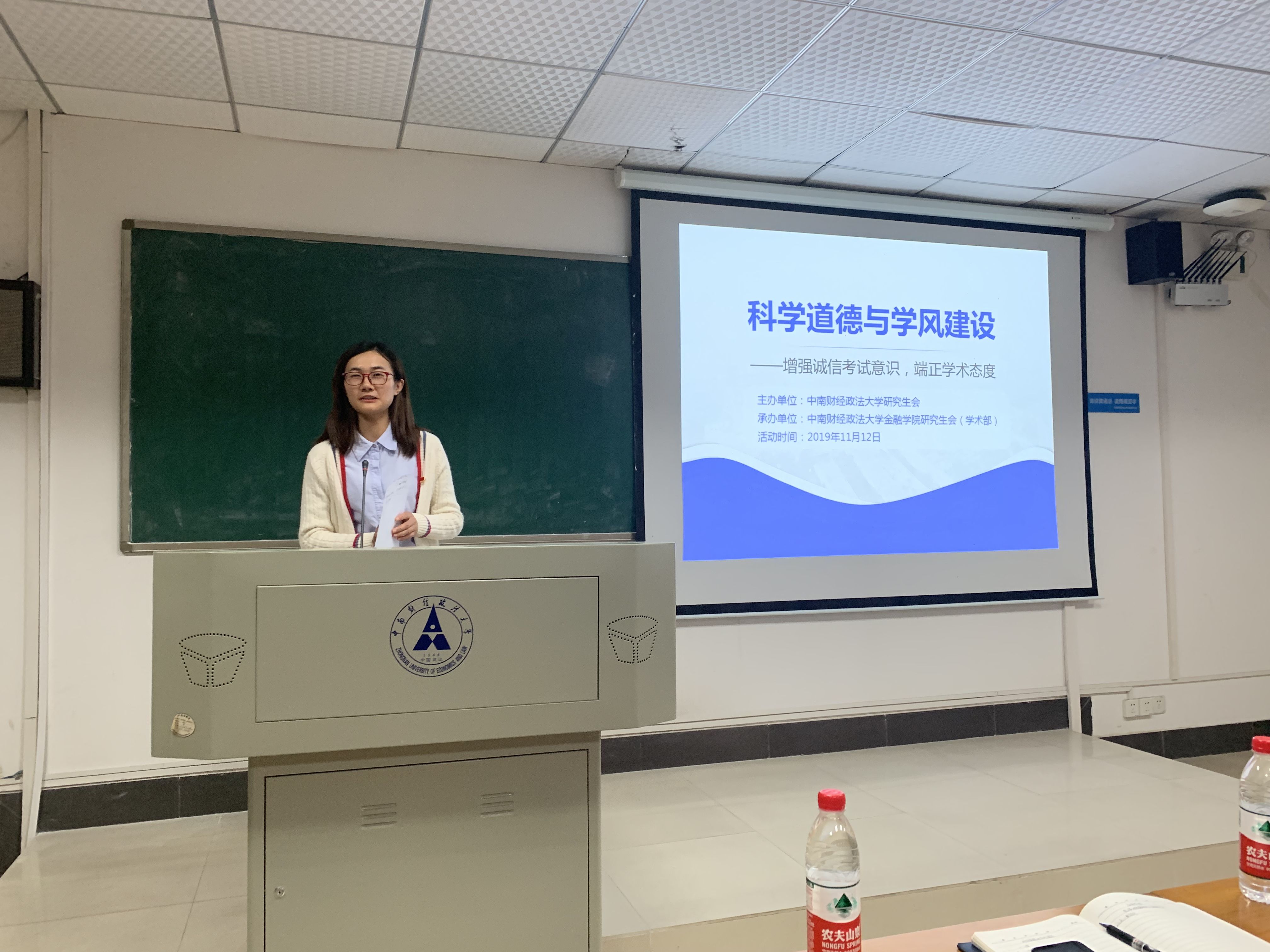 11月13日下午,金融学院学生会学术部组织2019级研究生在宿舍内共同观看《2019年全国科学道德和学风建设宣讲教育报告会》,会上指出,要弘扬科学精神,培养诚信的科研品行,踏实严谨的工作作风,切不可投机取巧,虚夸浮躁,绝不能伪造、篡改、抄袭触碰科研的“红线”。报告会深入推进“科学道德和学风建设”教育工作。
