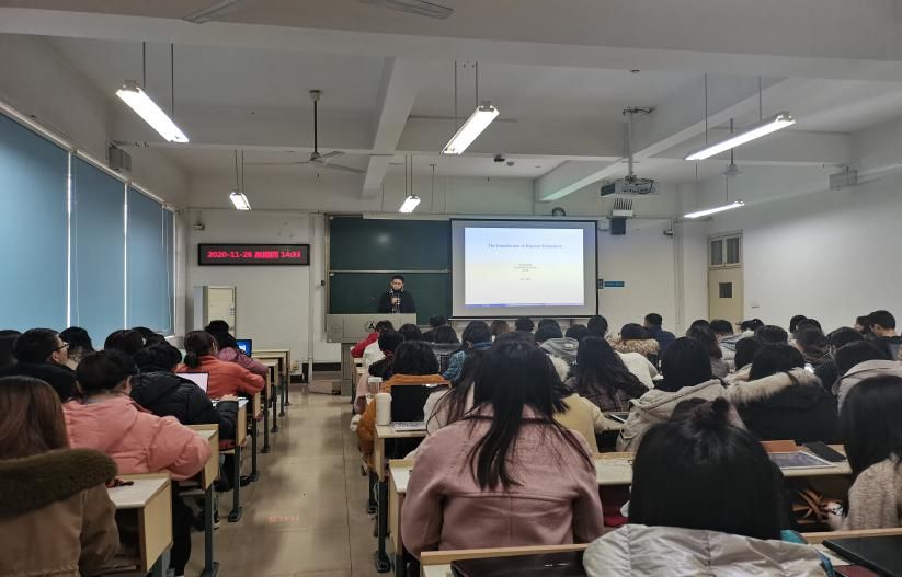 讲座中,谭用教授首先通过对比传统回归模型阐述了贝叶斯回归模型的进步性,并详细介绍了两者的区别和贝叶斯回归的基本原理;接着通过讲解Metropolis的算法,引出贝叶斯估计的具体步骤。贝叶斯估计在国内应用尚少,对其深刻理解的人也属少数,谭用教授运用其通俗的言语向在场师生分享了贝叶斯回归模型的相关内容,展现了扎实的学术能力。