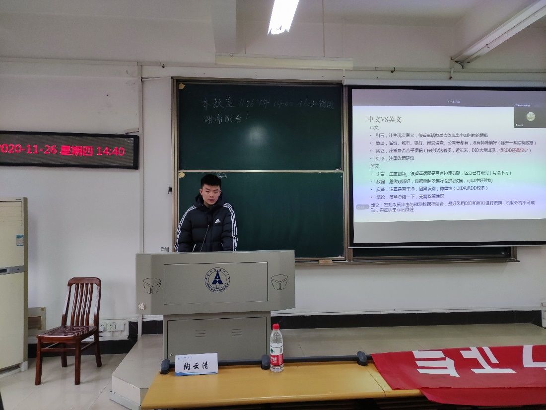 会议伊始,陶云清博士首先进行自我介绍,然后就自己博士研究生阶段受导师孔东民教授的英文指导和影响,以个人英文论文写作经历为背景,展开讲解英文论文从确定选题、完成初稿、投稿到外审修改直至录用发表过程中每个步骤的注意事项与经验方法,并分享自己在学术道路上遇到的困难以及取得的收获,给大家展现学术人应有的坚持和坚守。