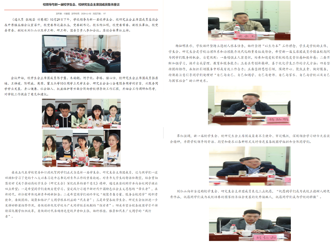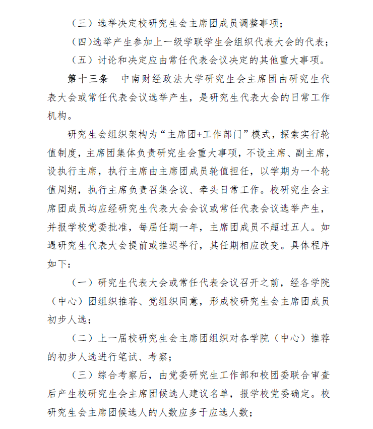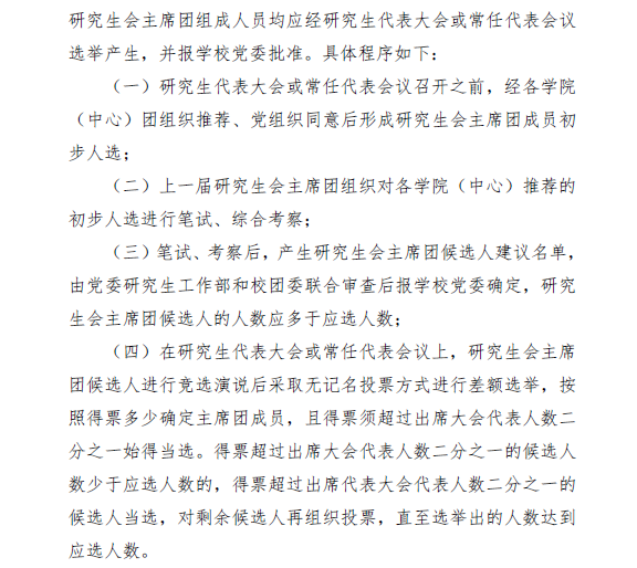 为落实共青团中央、教育部、全国学联联合下发的《关于推动高校学生会(研究生会)深化改革的若干意见》,以及《高校学生会组织深化改革评估工作方案》要求,接受广大师生监督,现将我校研究生会改革情况公示如下。