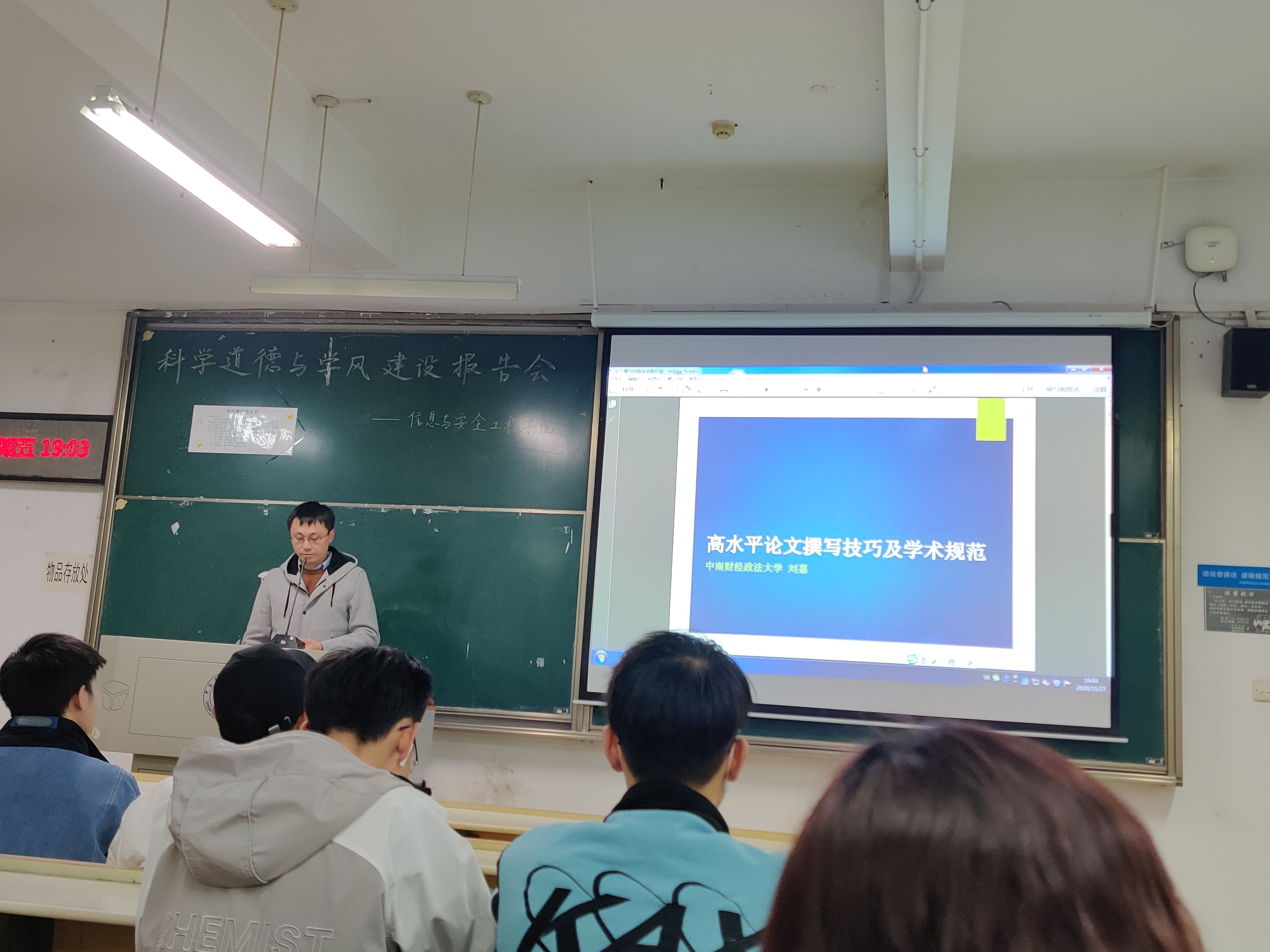 (通讯员:李必成、韩丰泽)11月27日晚,由我校研究生院、党委研究生工作部和校研究生会主办,信息与安全工程学院承办,以“科学道德和学风建设宣讲教育”为主题的报告会,在文添楼102教室成功举办。