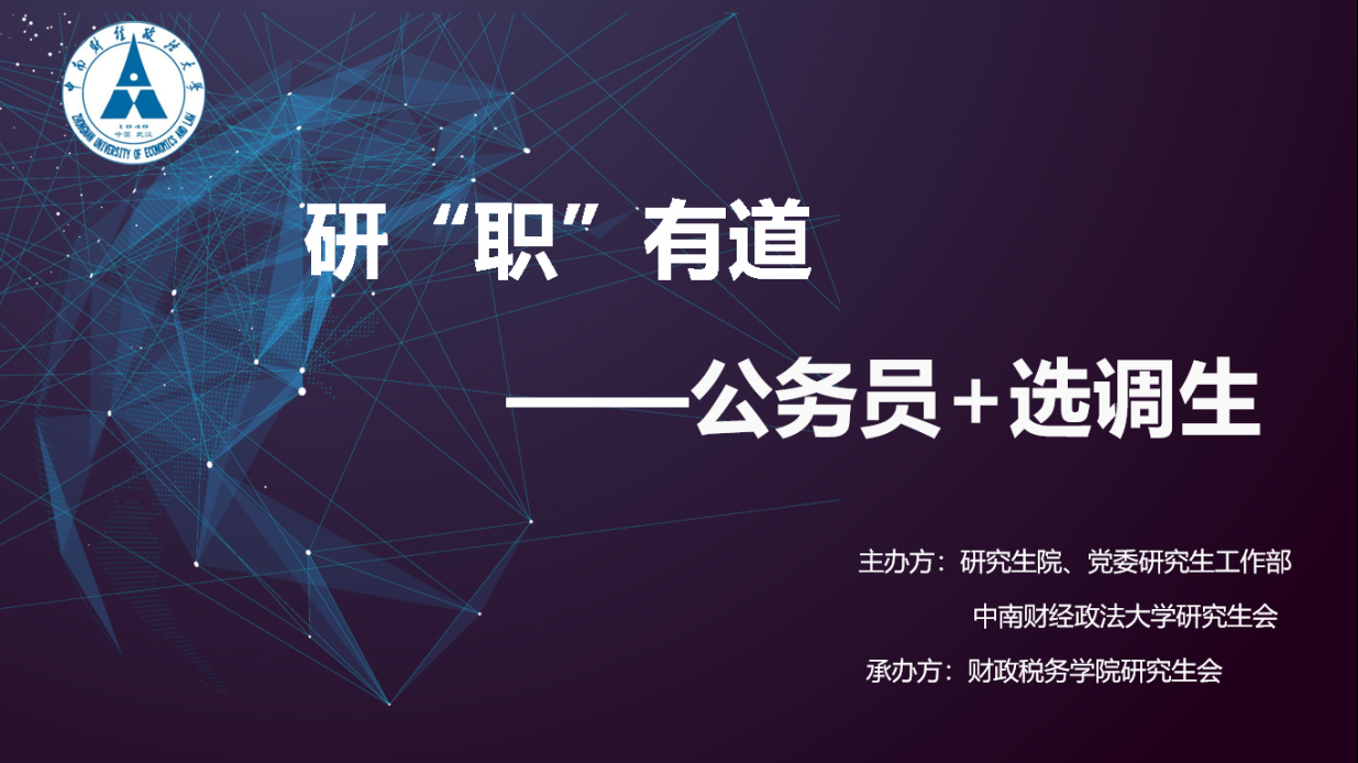 (通讯员:聂思凡 罗玉婷)2020年11月13日晚7点,第62期“研职有道”体制篇——公务员与选调生线上讲座在腾讯会议成功举行。此次活动由米兰电竞·(中国区)研究生院、米兰电竞·(中国区)党委研究生工作部、米兰电竞·(中国区)研究生会主办,财政税务学院承办。本次讲座邀请了宁波市税务局郑耀立、九江市税务局陈世帅、江苏省选调生封琳以及孝感高新区税务局廖梦婷4位嘉宾,此次讲座旨在为广大在校研究生解答就业方面的疑惑以及为各位在读研究生顺利进入体制内工作提供流程化、全方位的指导。会议由院研会成员李湘钰主持,财政税务学院辅导员程明梅老师全程参与会议。
