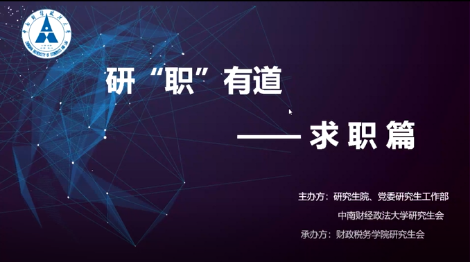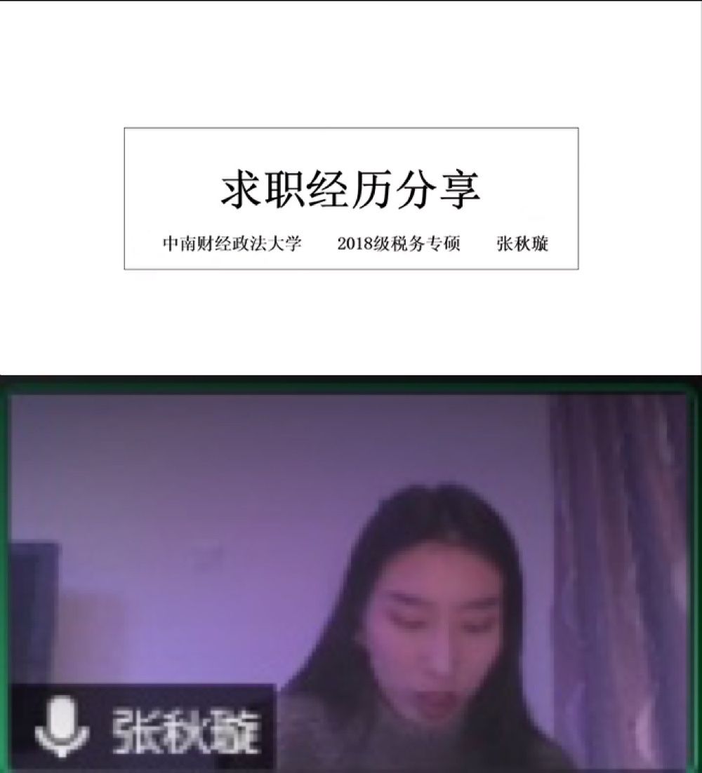 2020年11月27日晚七点半,第65期“财税有约,研职有道”——求职篇线上讲座在腾讯会议成功举行。此次活动由米兰电竞·(中国区)研究生院、米兰电竞·(中国区)党委研究生工作部、米兰电竞·(中国区)研究生会主办,财政税务学院承办。