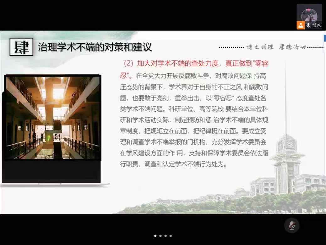随后,本次宣传教育活动对11月外国语学院举办的,以“科研诚信学风建设”为主题的学术沙龙活动进行了总结。过去的几次学术沙龙活动中,各级各班同学踊跃参与,积极互动。比如,19级、20级英语语言文学的同学以麦克尤恩以及他的作品《坚果壳》为主题,展示了其独具特色的原创性成果。20级外国语言学及应用语言学的邹冰同学号召各位研究生们,既要积极响应有关学风建设的各项活动,也要努力提升个人的学术修养,为学术之流长青贡献一份力量。