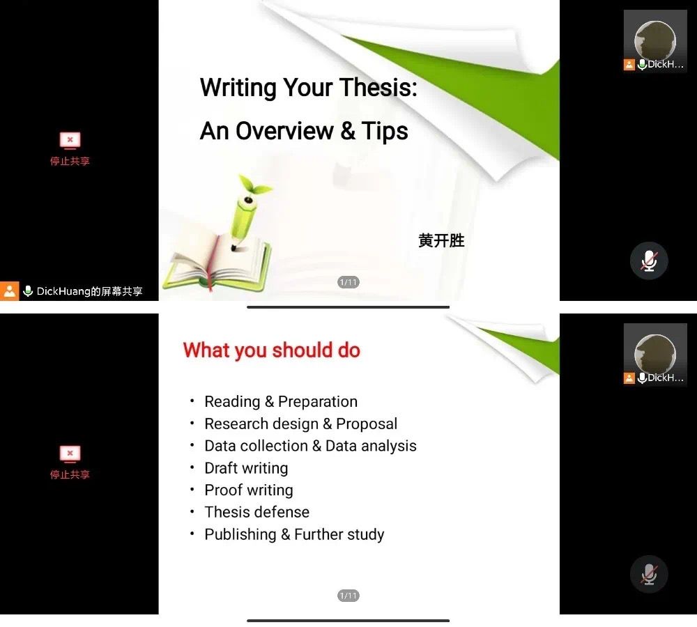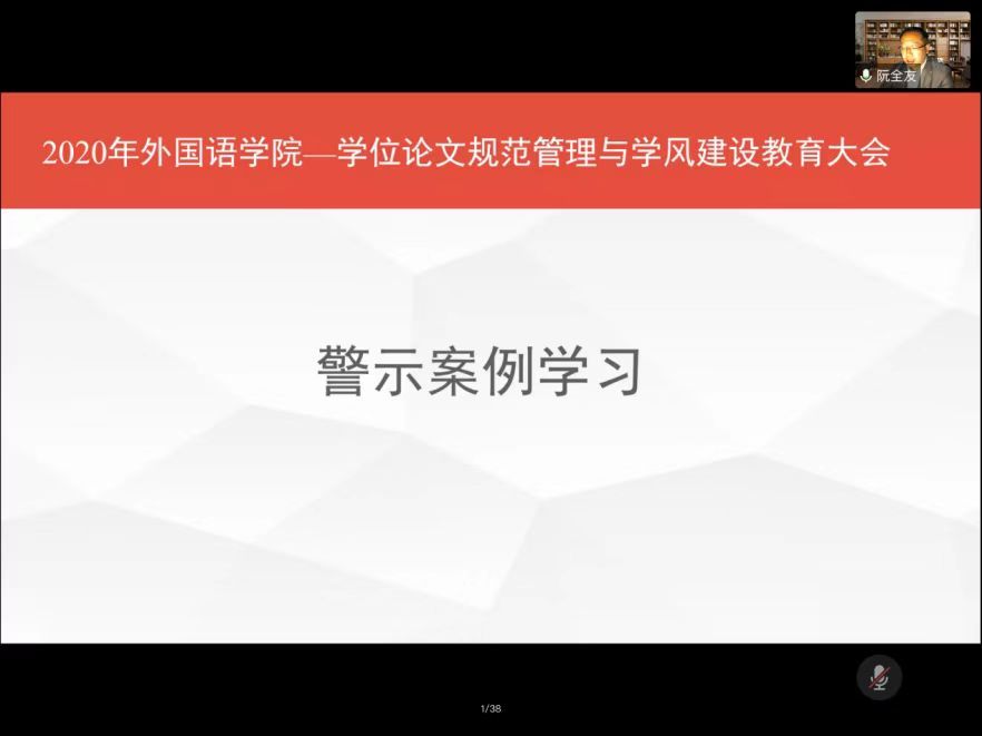 本次大会还谈到了2020年11月19日下午外国语学院举办的研究生学术诚信论文写作指导大会。英语语言文学导师组副组长李晶副教授、日语语言文学导师组导师付黎旭副教授、翻译硕士导师组组长、翻译研究中心主任朱勇副教授、语言学导师组组长黄开胜教授在学术诚信论文写作指导大会中为18、19、20各级相关专业的学生给予了耐心的教育和指导,强调了论文规范和学术道德建设的重要性,也为本次科学道德与学风建设教育大会打下了良好的基础。